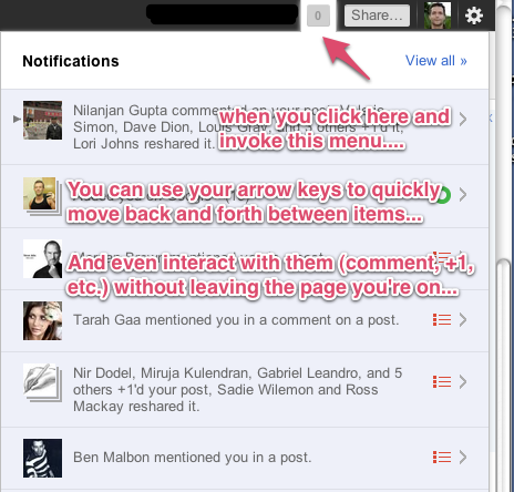 G+ Tip: Keyboard Shortcuts in the notification dropdown menu