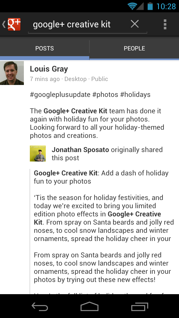 You can now easily search for Google+ posts and people in the Android app. To start searching, simply tap the new search icon from the app’s Home screen, then type what you’re looking for.