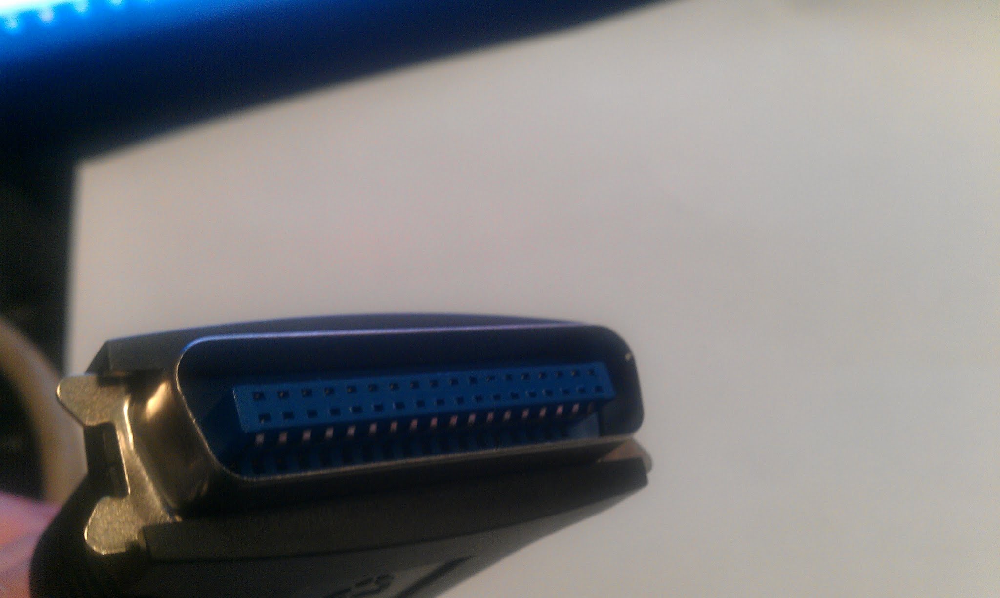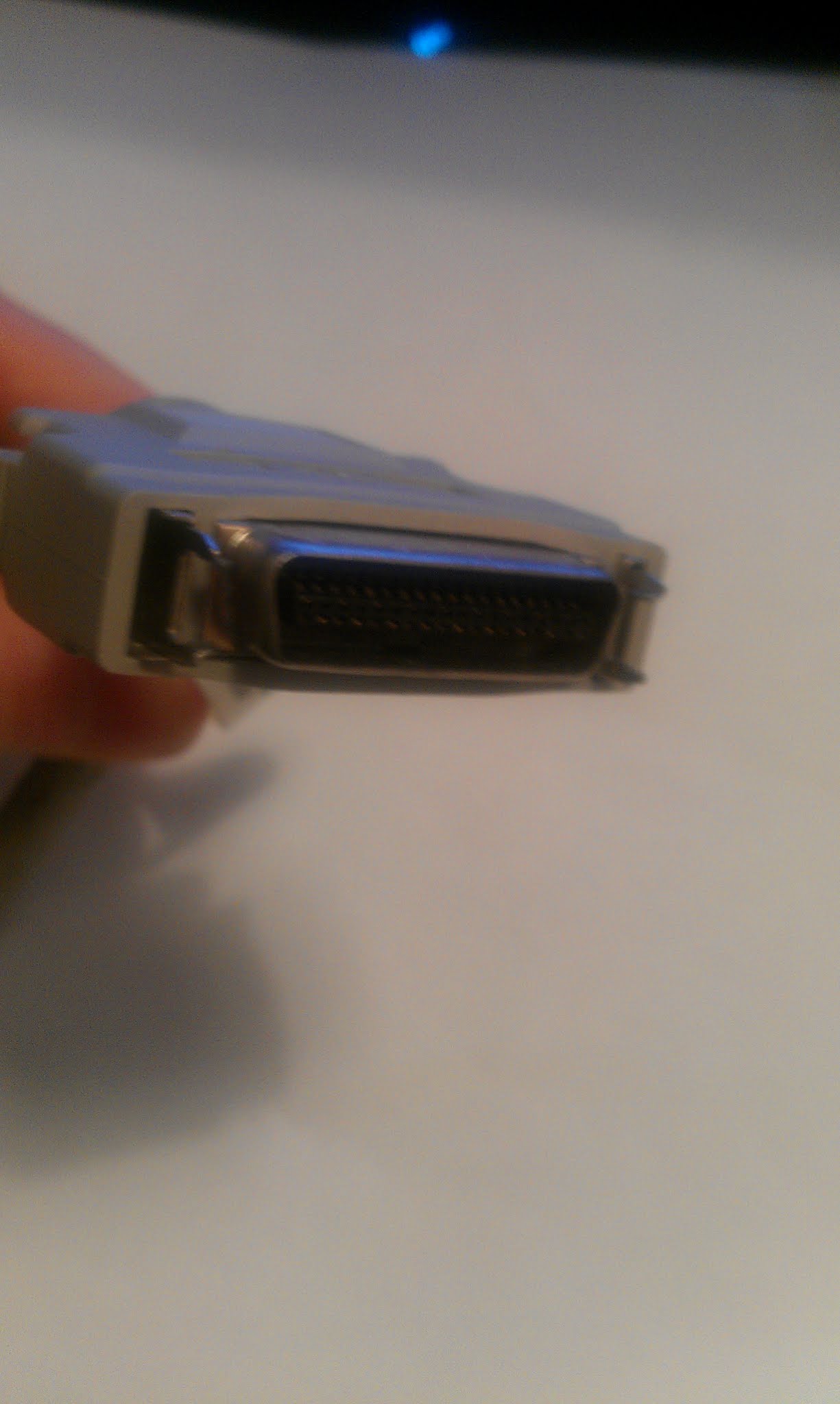 I was under the (incorrect) impression that there was only one type of parallel connection. I’ve taken photos of the three connections we’ve got. The smaller connection (the 3rd photo) connects into the back of the HP printer. The other end of this cable is a 25 pin connector (the 1st photo). Unforuntantely we want to connect this to the back of a Parallel print server which has another type of connection (the middle photo).